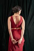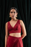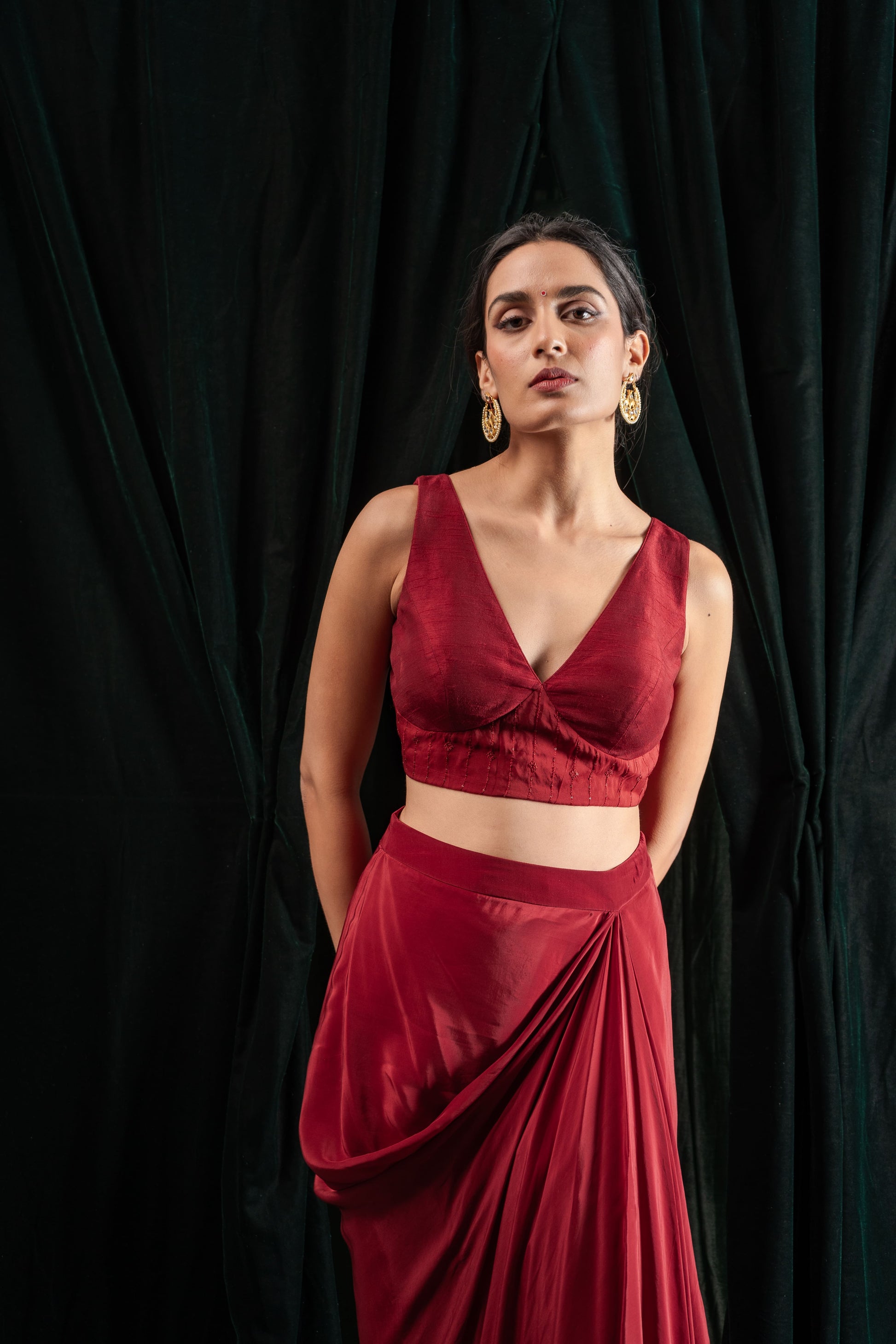 An Indian wardrobe essential, a burgundy blouse. V-neck blouse with a flattering V shape at the bottom. Padded blouse made in bambur silk, and an embroidered organza panel. Padded and back hook closure for ease of wear.